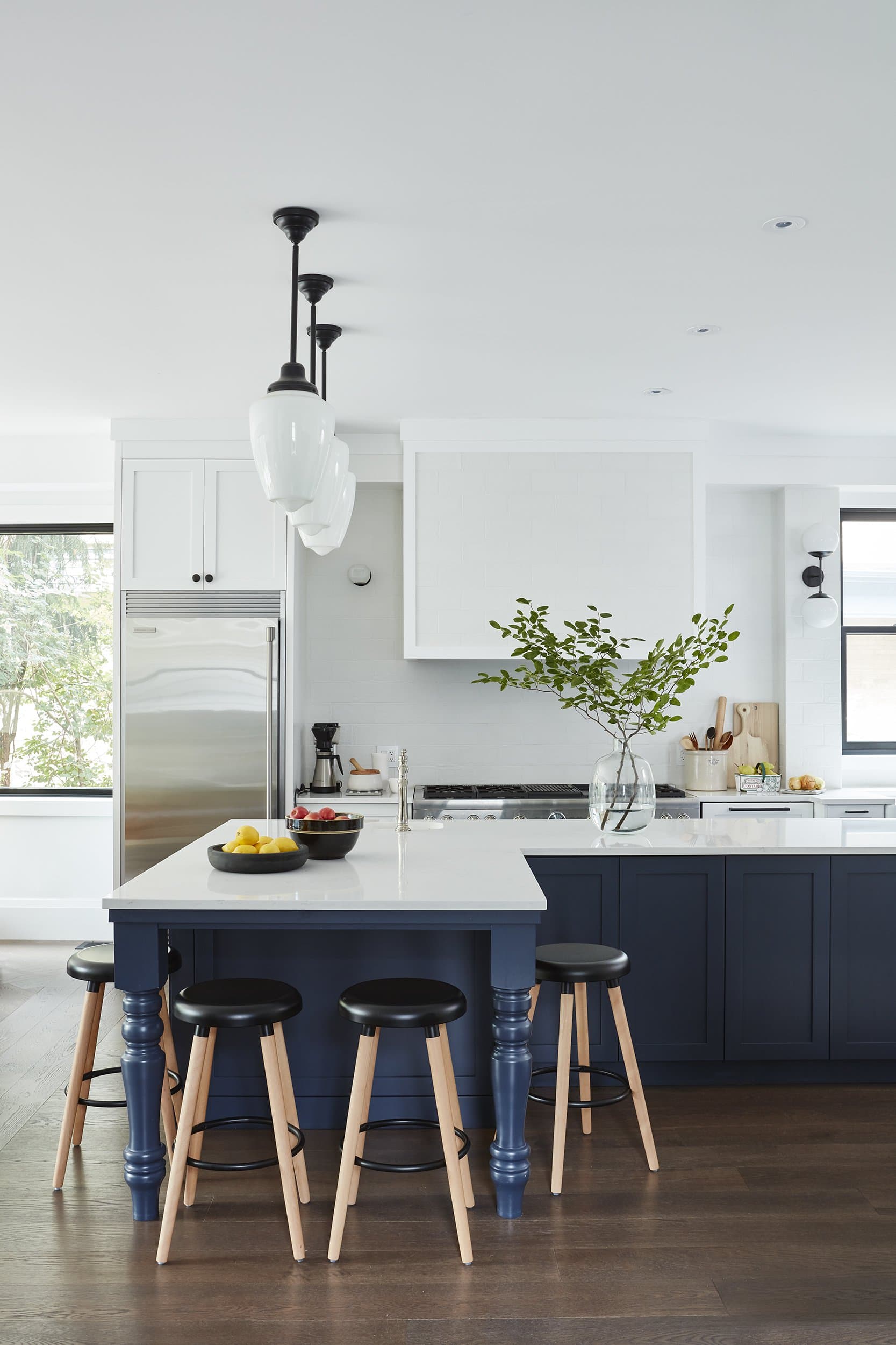 We also couldn’t forget that the kitchen was in full view of the front door, so thoughtful design plus a few special additions definitely had to come into play. That meant vintage lighting, oak flooring and simple shaker cabinets used throughout, painted in Benjamin Moore Hale Navy for the island and in Decorator’s White for the rest of the space.
