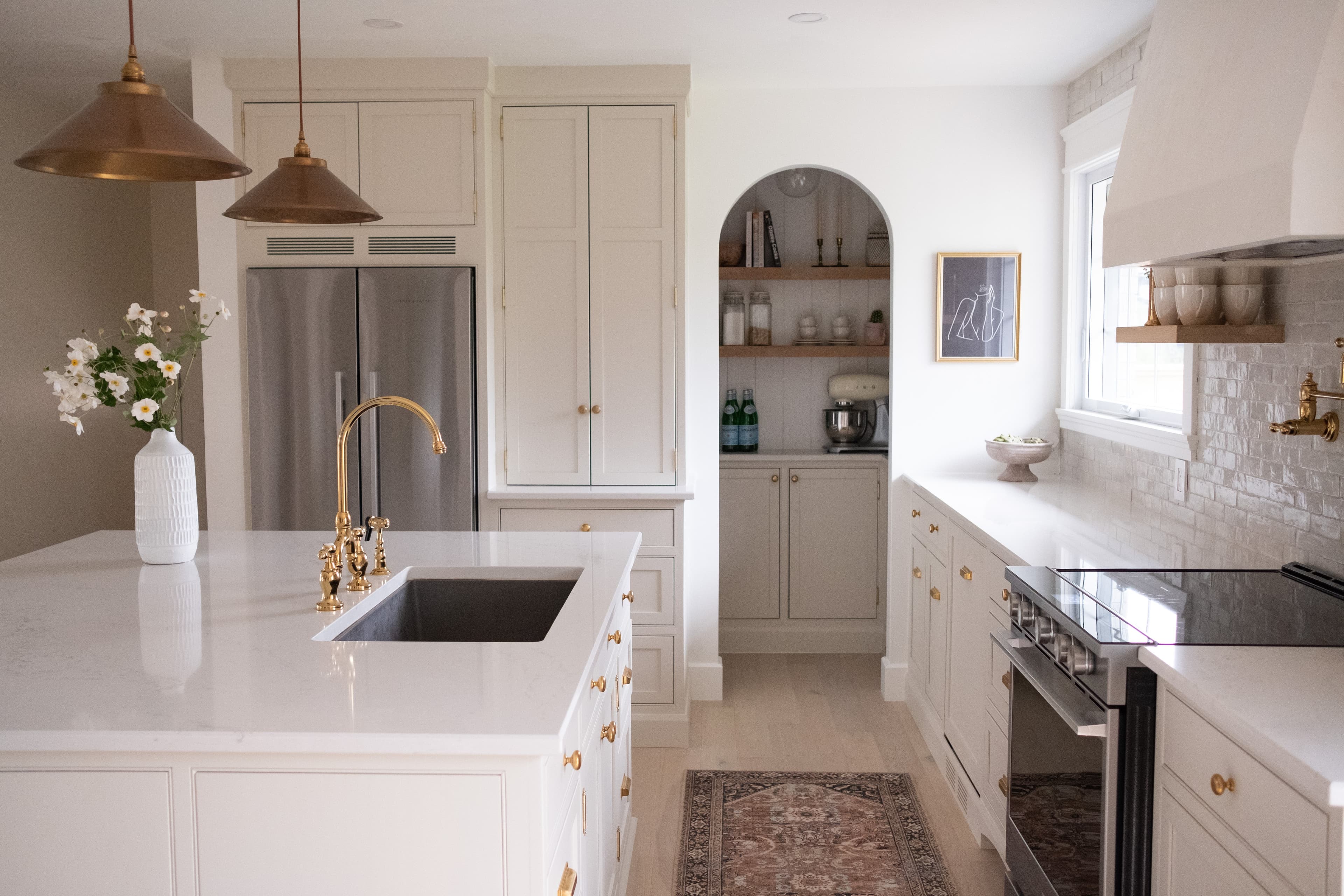 When we began drafting concepts for our small bungalow, we wanted the kitchen to be the star of the show. We love to host and cook, so we wanted a space that was not only beautiful, but practical and durable as well. We went with an earthy palette of colours; white oak, natural cream, un lacquered brass, and our favourite piece - our HanStone Montauk quartz countertops.