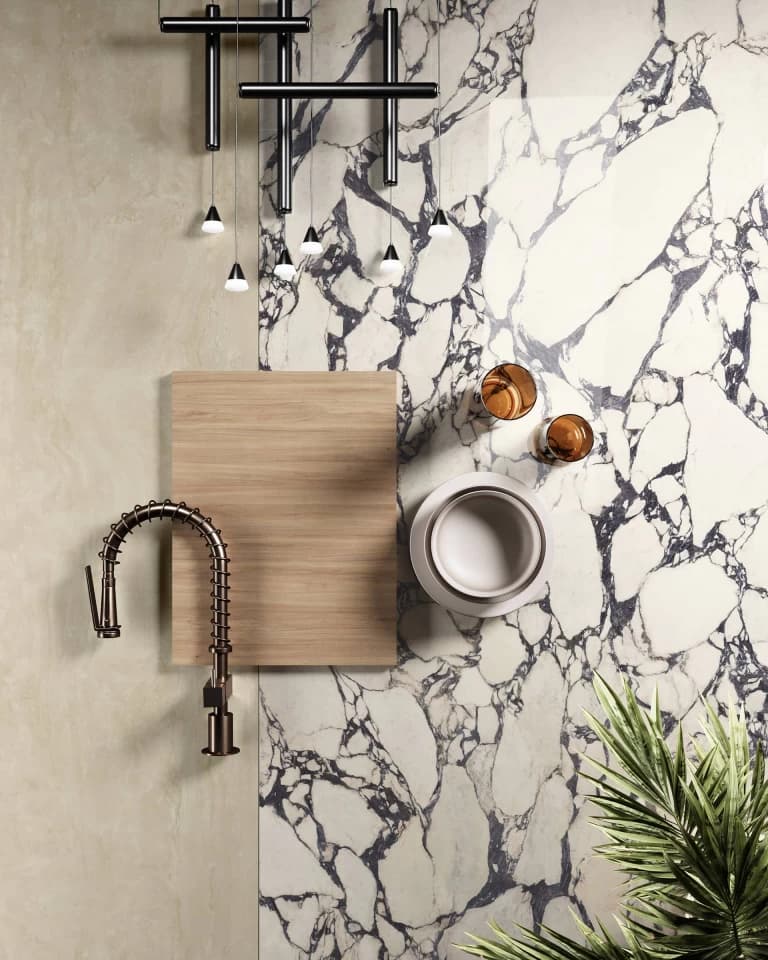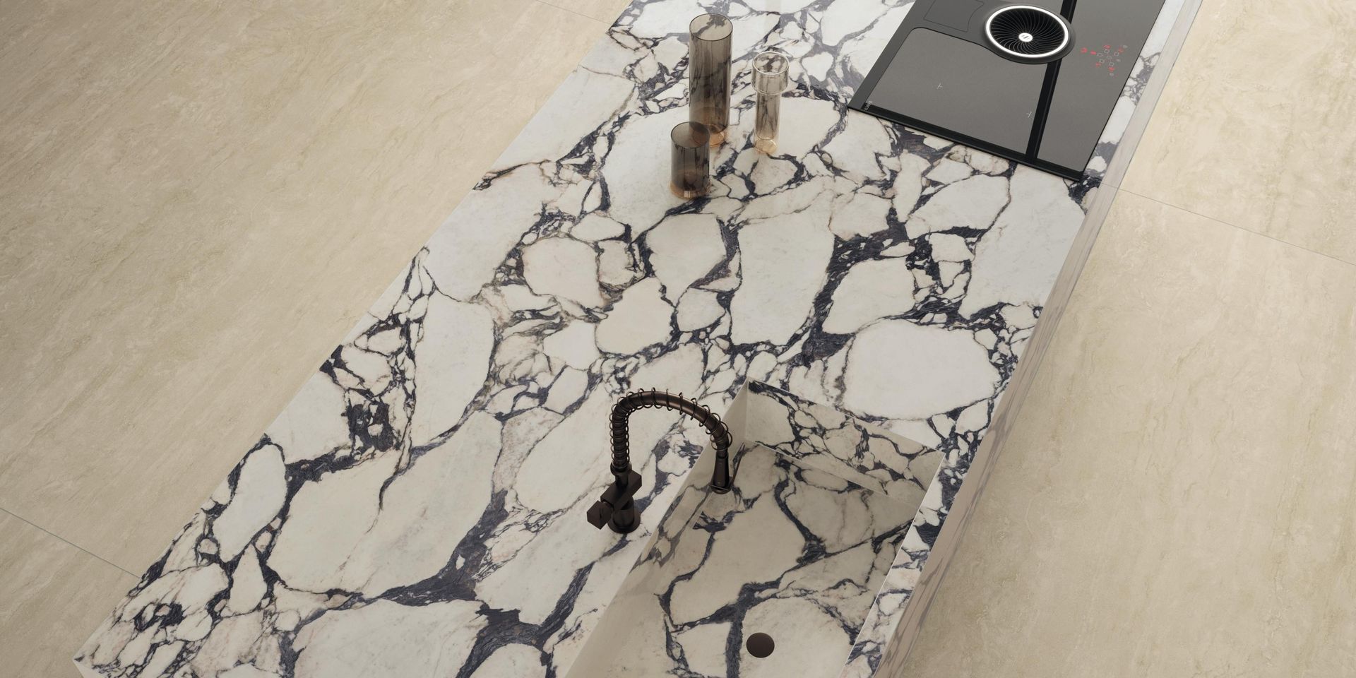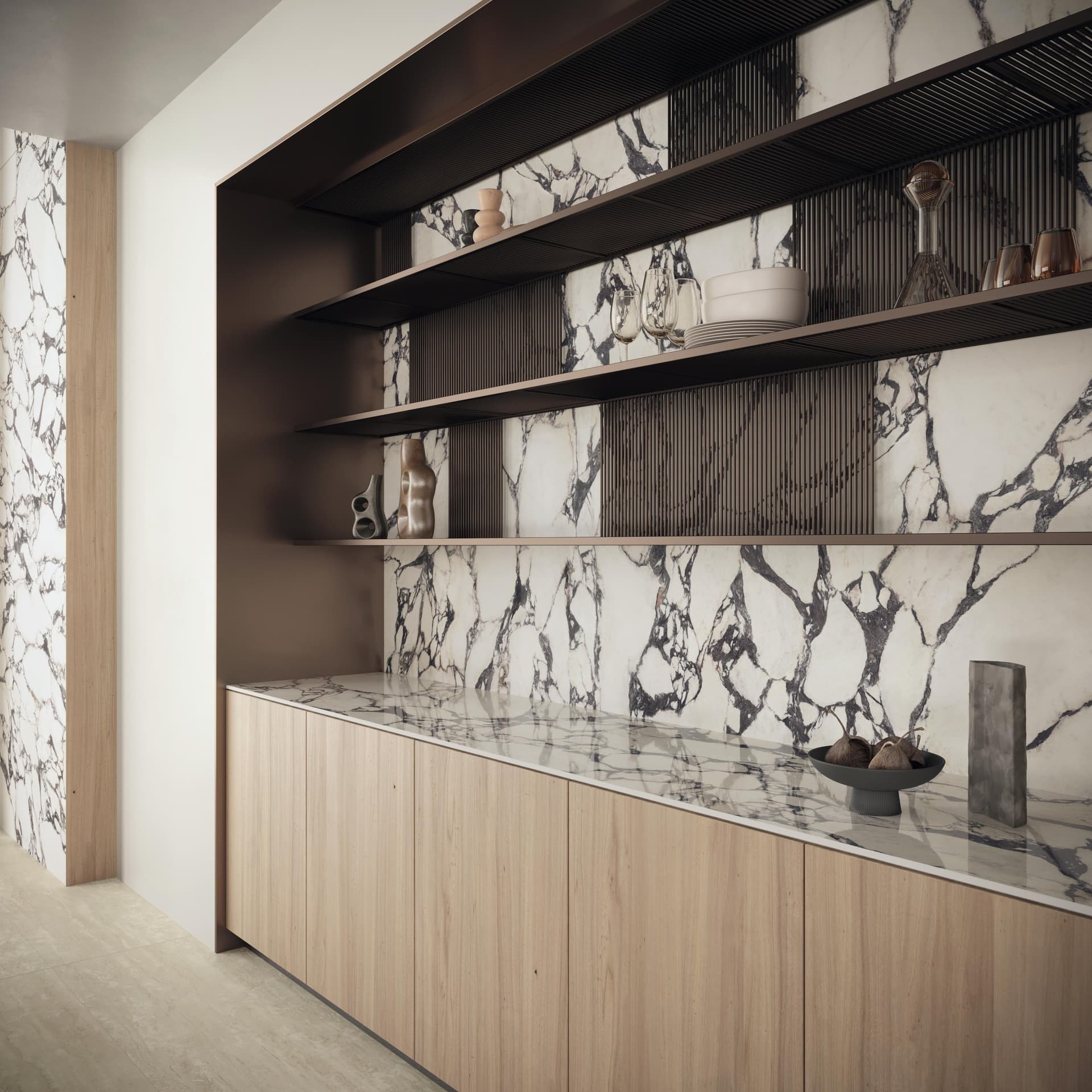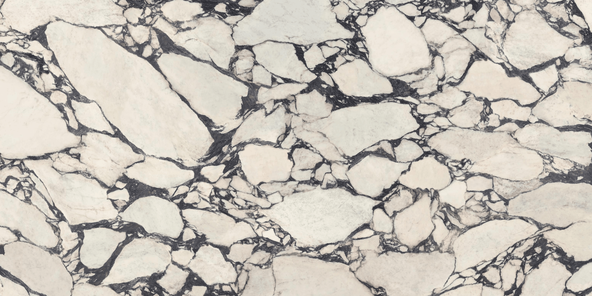 A warm white base dramatically contrasted by striking deep plum veining. Its bold movement creates a statement surface that balances elegance with dramatic sophistication.